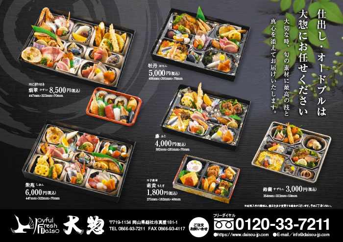 料理、正月料理、仕出し料理、さわら料理。岡山市、倉敷市、総社市など岡山県全域にご提供しています。